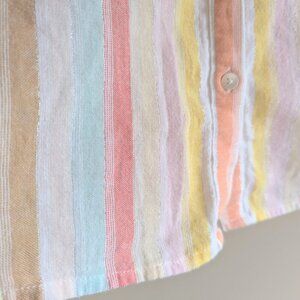 Lightweight and breathable, this colorful and playful striped top is perfect for those hot days. Simple collared button down shirt with a touch of class. Metallic threading elevates the look.