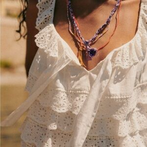Elegant white tank with eyelet design. Features layered ruffles. Ideal for warm days.