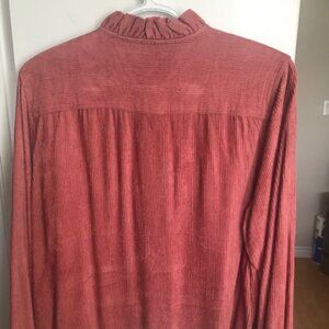 Sezane Kim button-down corduroy rosewood shirt with two front flap pockets, buttons all the way down the front, and three on each cuff. Gently used but excellent condition from a smoke and pet-free home. Size is 36/4 but is oddly larger than the khaki version (also posted on here) and would easily fit a size 6. Armpit to armpit is 20". 100% viscose.
