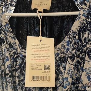 Elegant blue midi dress by Sezane. Features intricate patterns and long sleeves. Perfect for any occasion.