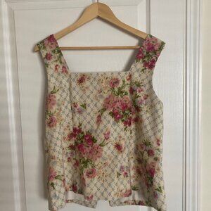 Sleeveless printed linen and cotton blouse