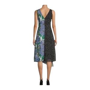 Features a faux wrap design, side zipper, Unique contrasting patterns on each side, asymmetrical hemline, and lightweight material.
