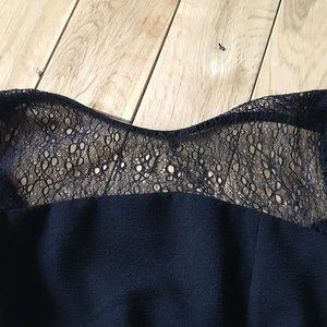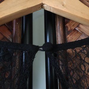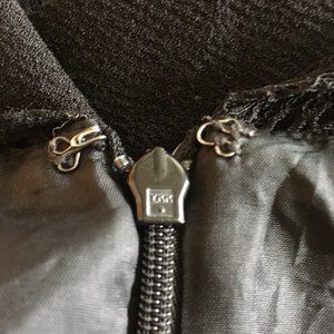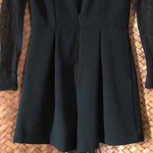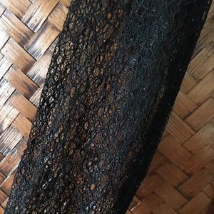 Fair preowned condition, black romper/playsuit with pleated crepe fabric on the lower body and lace on the upper by Topshop. The fabric on the body is very nice and papery. Feels like a Chirimen crepe. The lace is a little tight on the sleeves and shoulders and there are some snags here and there (I took pictures of some of them. They're a little hard to see in the photos, but they're there). Could be repurposed and the top replaced or taken out and simply worn as is or with a shrug. The quality of the bodice is very nice. Would be perfect for a Halloween party or Rocky Horror Picture Show outing. Free with $50 purchase.