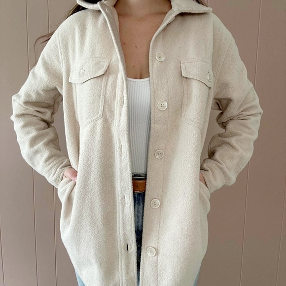 Long light cream colour shacket. Perfect for layering. Stock photo.