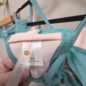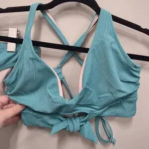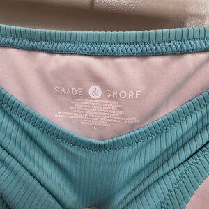 Refresh your swimwear collection with this gorgeous Shade & Shore bikini set in a soft teal/aqua ribbed fabric with light blush lining. The top offers great support and an adjustable fit, while the matching bottoms complete the look with classic coverage.