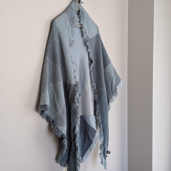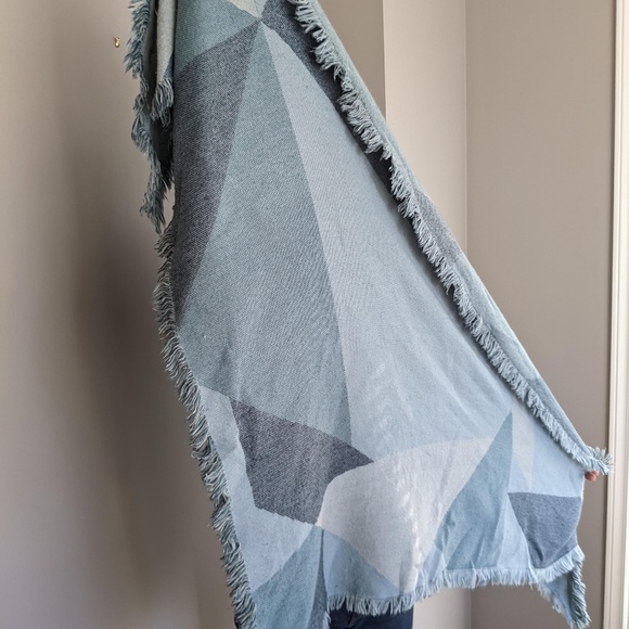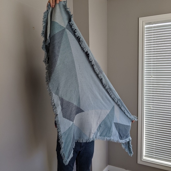 Love and Lore cheerful triangle blue blanket scarf with various shades of blue.