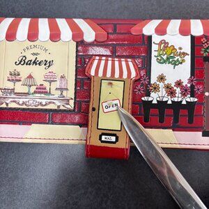 Add a touch of whimsical charm to your accessories with this Shag Wear vegan leather wallet. The playful design features a red brick wall storefront with flower boxes, a bakery sign, and a green bicycle—like a little street scene in your hands. Crafted from durable vegan leather, this wallet is as practical as it is stylish.