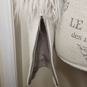 Silver zippered fabric fitted sleeves, multi hook and eye front closure, fully lined, Like New, Size L fits more like an M, Pit-17, Waist-14, Sleeve-23,