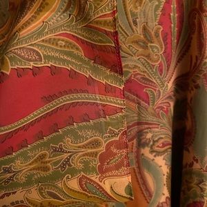 Size 2 (about a medium). Shamask has always listed their sizes in 1, 2 of 3. Armpit to armpit: 26”, length approx 28”, 100% silk, 3/4 sleeve, lined. No visible flaws. Gorgeous fall colours. Red, orange, green paisley type pattern. Flowy lagenlook.