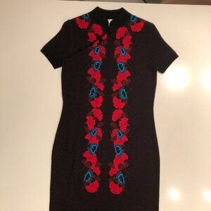 Shanghai Tang Gingko Cashmere + Wool Short Sleeve Knit Dress in Black with a Detailed Pattern in Red, Burgundy & Turquoise Blue, Designer