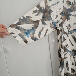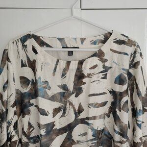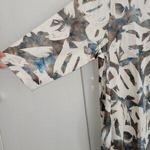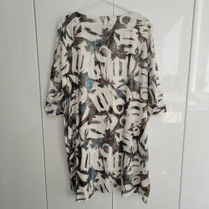 modern dress in geometric print in soft, neutral colours of brown, blue and cream