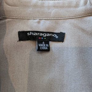 This is a Sharagano 3/4 zip designer dress with belt and roll up sleeves Size 4. There are 2 sets of pockets in the front and a long gold zip up in the front.