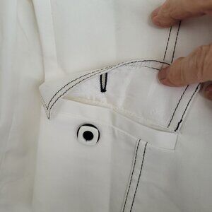 black sharp stitches around front, pocket and darts; matching black/white buttons, 98% cotton and 2% lycra; 100% lined even the sleeves;