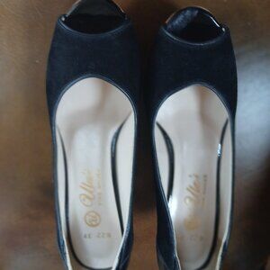 Sharp pair of suede/ patent leather pumps with short, stout 2" heels. Peep toe style. Hand made and new and unworn. Made in Europe. Man made outer sole and padded inner footbed.