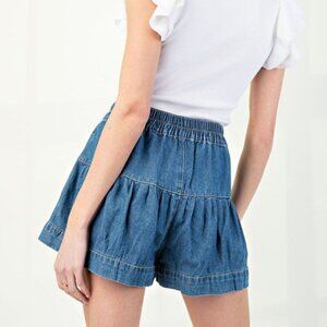 Mineral washed shorts featuring an exposed button fly, tiered seaming, two side pockets, a back elasticized waistband and is a relaxed fit body.