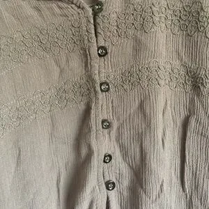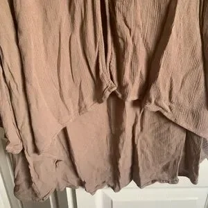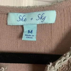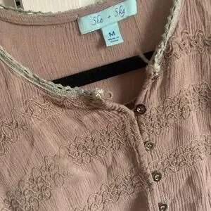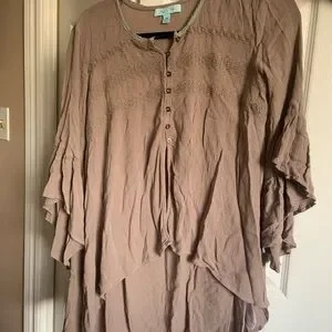 This She + Sky tunic showcases a warm brown tone with a relaxed fit and ruffled three-quarter sleeves. Its flowing silhouette and buttoned neckline create a chic, laid-back style perfect for everyday wear. Last picture shows a string that you could just cut off doesn’t affect the top from the inside