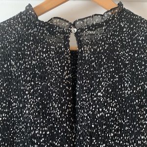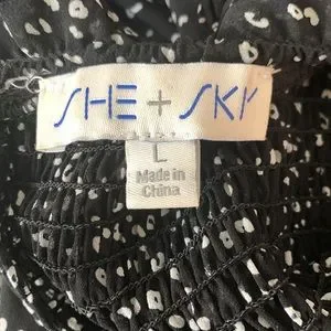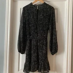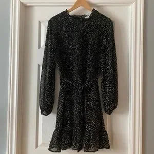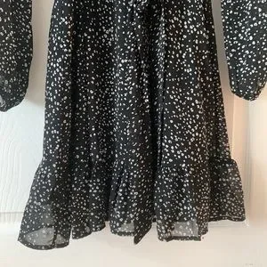 Flirty, light and detailed She&Sky mini dress, fully lined with sheer long sleeves. Smocking at top of dress for a comfortable fit. Small ruffle detail at neck and tie belt. Flowy light skirt. Button closure at back of neck.