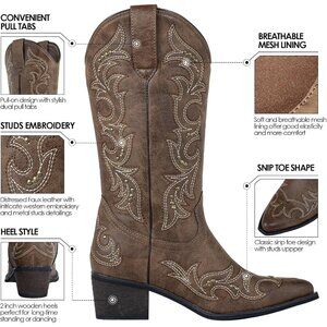 Material: Distressed brown cowgirl boots made from textured faux leather with comfortable mesh lining, offering a rustic and authentic western feel