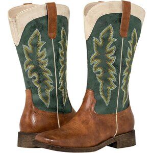SheSole Western Boots Women's Green Tan Faux Leather Square Toe Wide Mid Calf