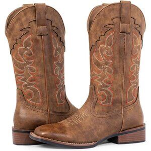 SheSole Womens Dark Brown Cowgirl Square Toe Wide Calf Low Heel Western Boots