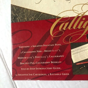 Kit to learn calligraphy! Includes instructions, templates, two pens, three different sized tips (small, medium, and large). Includes all the original ink cartridges. Some are still unopened but unfortunately they are all dried up. So you will need to purchase cartridges in order to use this pen. They can be purchased at any Staples or likely Amazon would have them too.