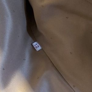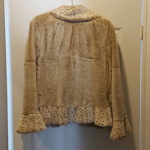 Very flattering ruffled wrap around collar. Ruffled cuffs, so very soft. Closes with a hook & eye. Worn a handful of times. It says size 12 but fits more like a 10