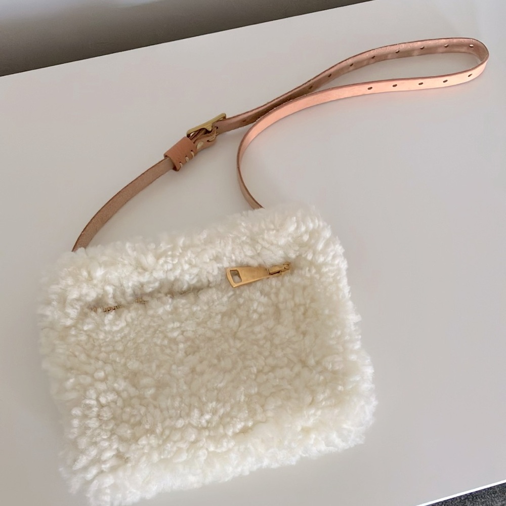 Classic shearling fanny pack in cream with tan leather and gold hardware. Like new condition. Small, Canadian, woman-owned business.