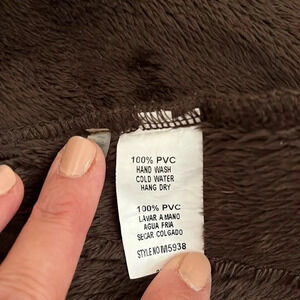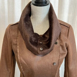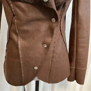 MIILLA clothing Fitted faux fur and faux shearling dark brown jacket. The material looks like shearling but is made of PVC material.