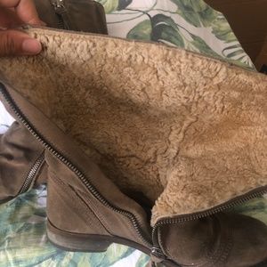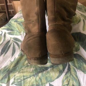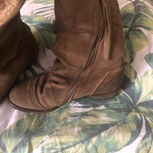Beautifully made tan suede boots with wooden sole and inner zipper.