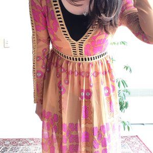Sheer, but has built in bodysuit. Crochet details down sleeves, at bust/ neckline and waist.