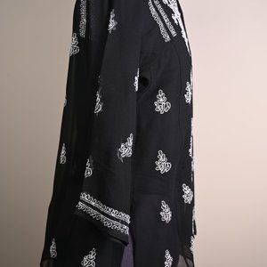 Beautiful sheer black top with white embroidery and tiny aqua sequins. Wear with a little black cami (not included) for best effect.