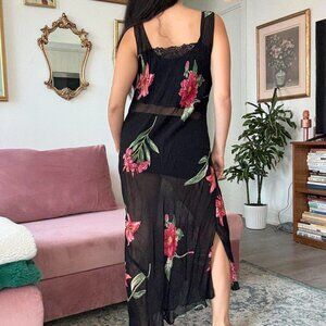 Gorgeous, sexy sheer black vintage dress with red floral design throughout.