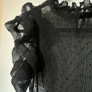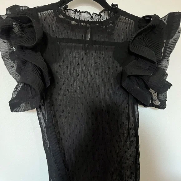 Going out black sheer top with structural ruffle sleeves. Perfect for a stylish look.