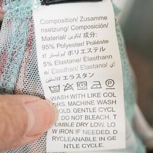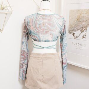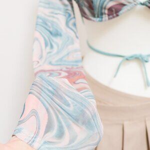 Shades of blue, seafoam green, brown and beige swirl pattern bra top with sheer flared long sleeves. Sweetheart neckline and tie waist detail. Made in China