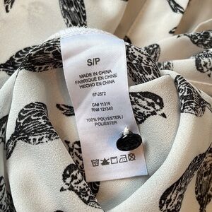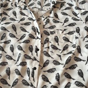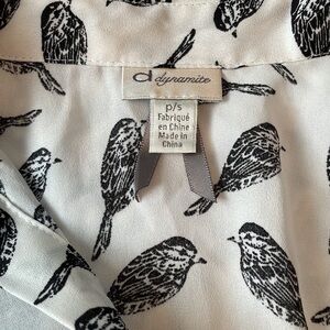 Excellent condition white with black birds 3/4 length sleeve collared button up sheer blouse by Dynamite. Cute tie at the bottom of the blouse’s front. Buttons to do up sleeves.