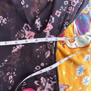 Lovely sheer blouse in deepest navy with pale pink abstract floral print. 3/4 length sleeves, Tuxedo-style pin-tuck detail on chest, charcoal pearlescent buttons.