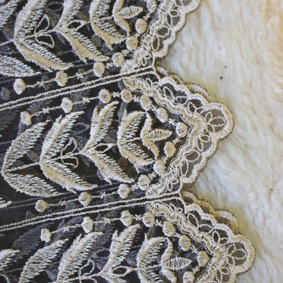 A gorgeous black sheer golden embroidery shirt. This small-medium blouse is perfect for a celebratory party, or a fun dress-up occasion. Features two gold buttons on the back to button up the neck. It has a comfortable sabrina/jewel neckline. The sleeves are long with the lace gently dancing across your fingers.