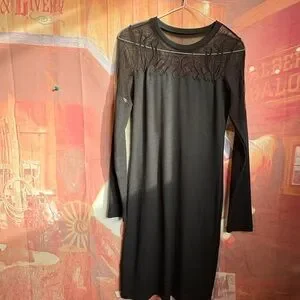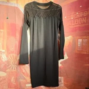 Super flattering black ribbed knit dress with sheer mesh yoke and embroidered flame/vine detailing across the chest and shoulders. The mesh adds that slightly edgy, romantic vibe without being over the top.