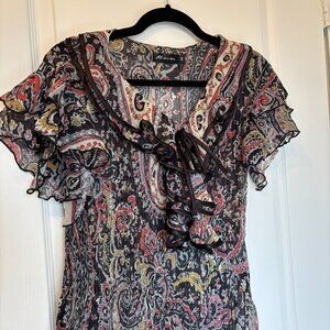 Sheer Paisley Ruffle Blouse Boho Tie-Front Top Size Medium