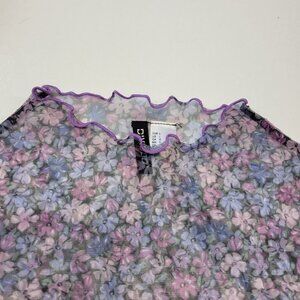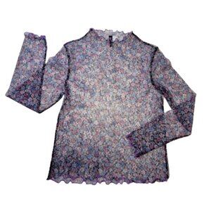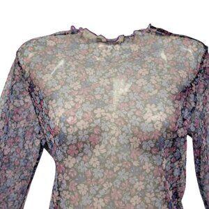 Sheer Purple High Neck Long Sleeve Floral Print Blouse Top Size L