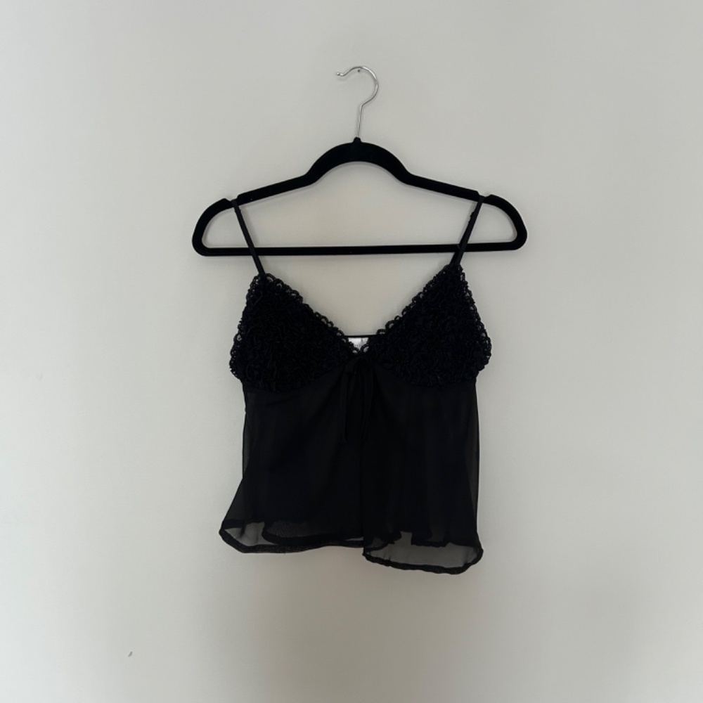Super cute black sheer camisole top with ruffle cups and adjustable straps. Body of the tank top is sheer with opening in the front. Cups are not sheer. Size XL from La Senza but fits more like a MED. This has been hand hemmed (picture of close up). Such a cute top for a night out!