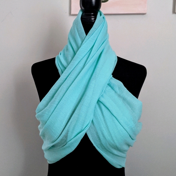 This can be added onto any other items in my closet for $5. A basic sheer aqua scarf I got as a gift (does not have a label). Shown is an example of how it could be worn but this would only fit an XXS-XS frame as a top.