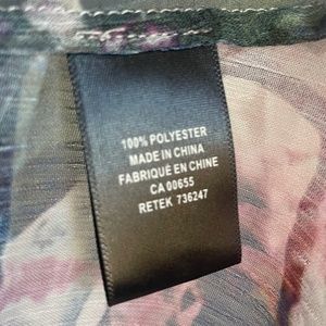 RW & Co; size small; navy white burgundy floral abstract print. Sheer; V-neck; pleats in back; drop hem in back.