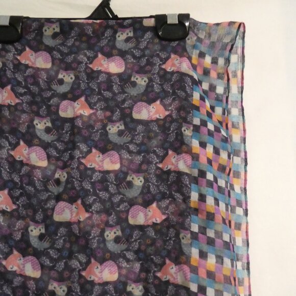 Sheer Sleeping Fox and Owl Infinity Scarf with Checkered Pattern Boarder