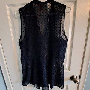 Sheer, navy blue top with shimmery polka dot pattern. Peplum flare with Asymmetrical detail in front.
