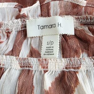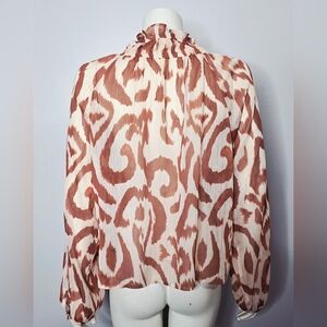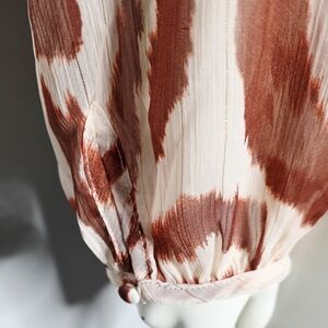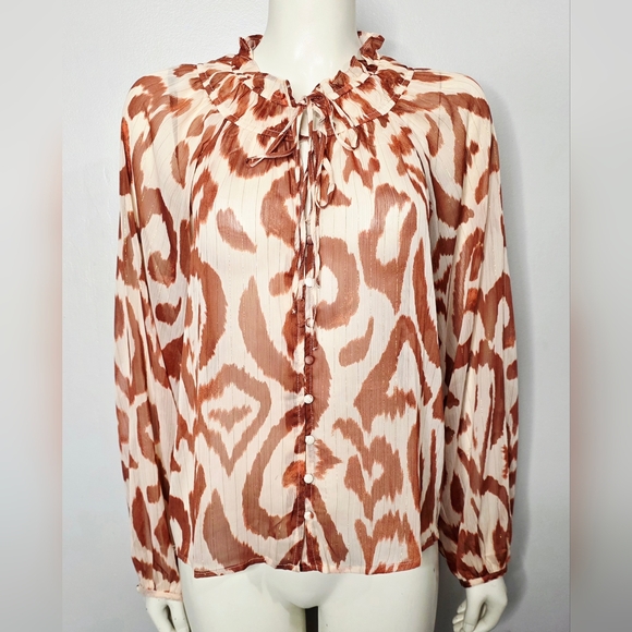 Boho sheer blouse in an orange/rust animal print on off white with metallic threading.