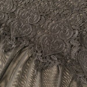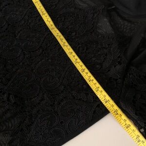 Sheer mesh high neck top, 3/4 sleeves with crochet lace detail on front and sleeves.