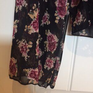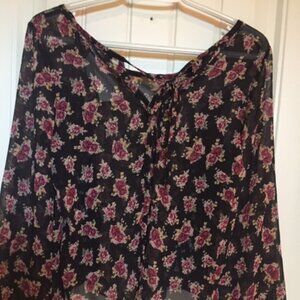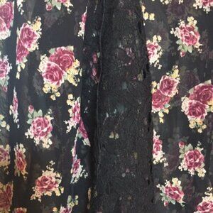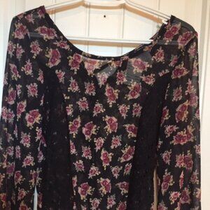 Sheer blouse with lace insert. Tied at back. Brand : Deb. Fabric : 100% polyester body and 65% cotton/35% nylon lace. Color : Black floral print. Size : Small.