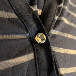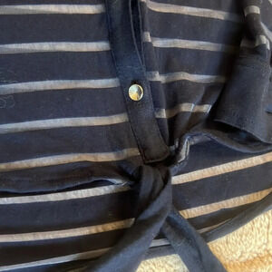 Super stretchy collared button down in navy with sheer stripes and crystal buttons. Missing crystal on bottom button.