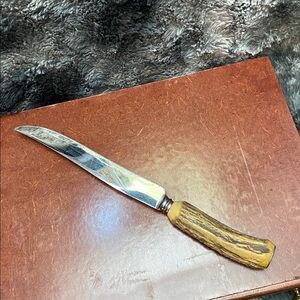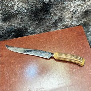Elegant carving set with antler handles. Includes knife, fork, and sharpening steel. Perfect for special occasions. This is a vintage item and there are scratches on the knife. But overall great condition.